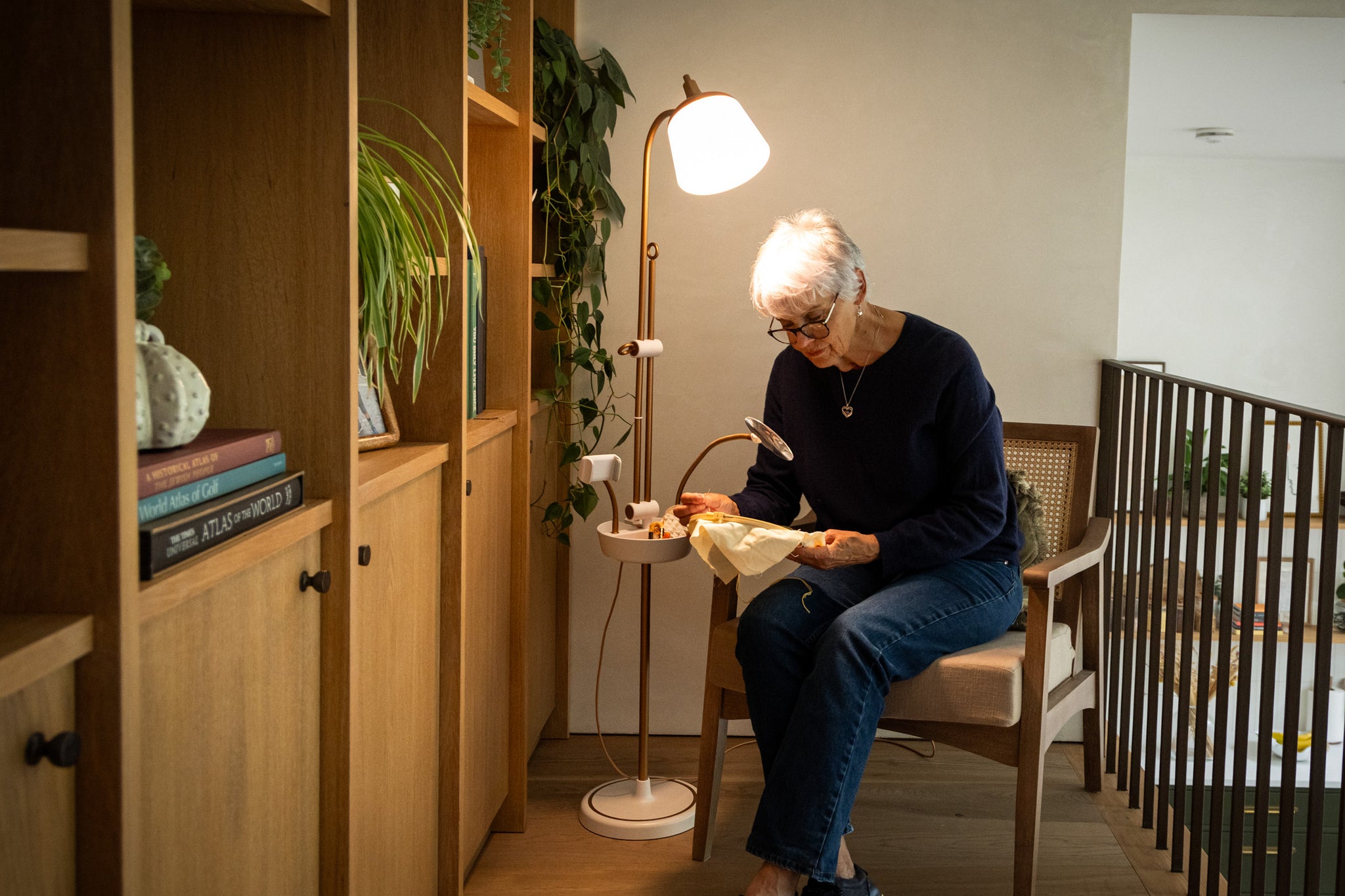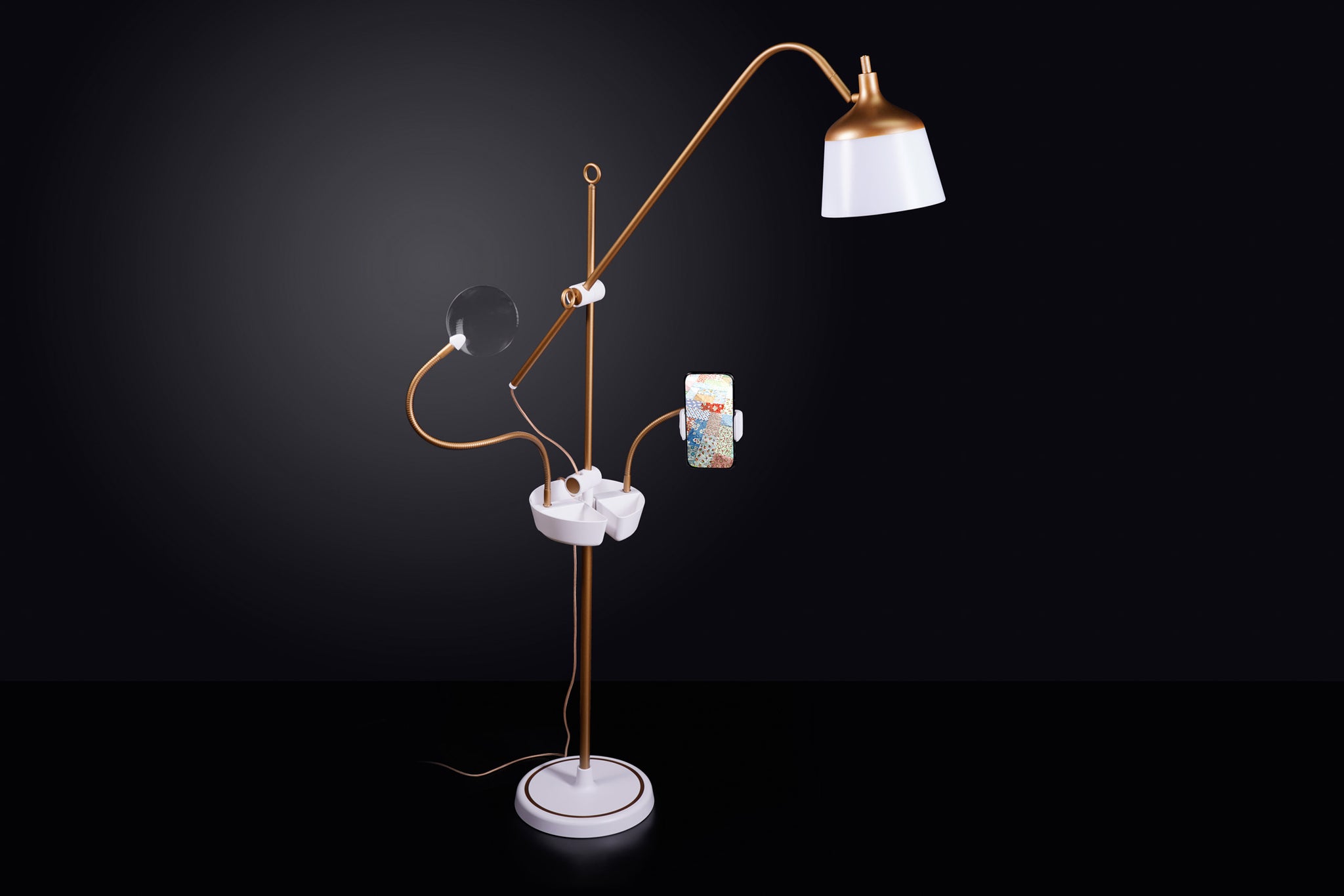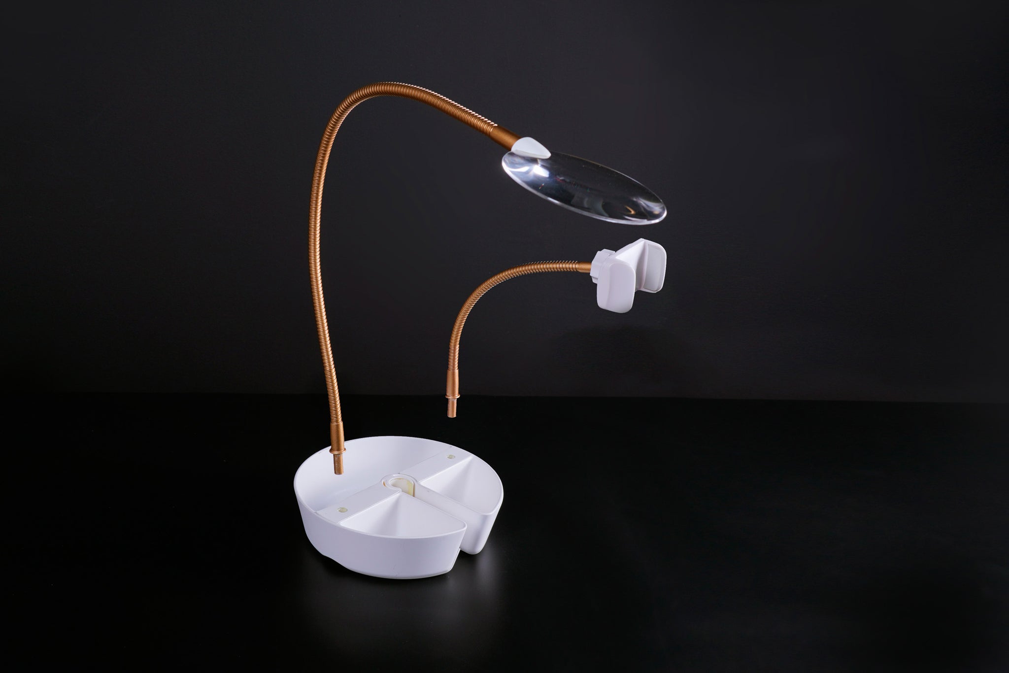 The perfect crafting floor lamp with a built in magnifier, phone clamp, and storage tray, featuring 6,000K LEDs with a 95+ CRI, ensuring true colour accuracy for your fabric and thread at any time of day. Offering 2,600 Lux of adjustable brightness with a continuous dimmer switch, easily find the ideal light for your sewing and crafting projects.
