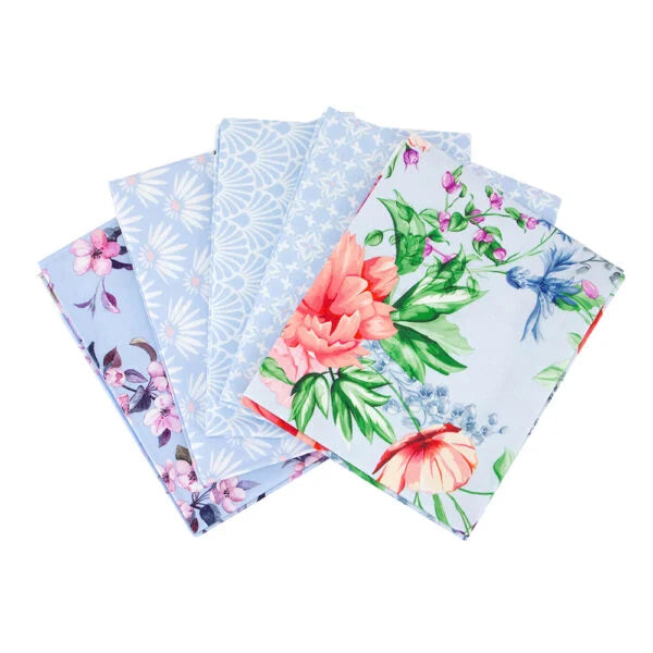 Each bundle contains 5 fat quarters measuring approximately 55 cm x 45 cm, giving you a versatile selection of complementary prints that work beautifully together or alongside other fabrics. The delicate floral designs and soft colour palette make this bundle perfect for quilts, cushions, bags and craft projects.