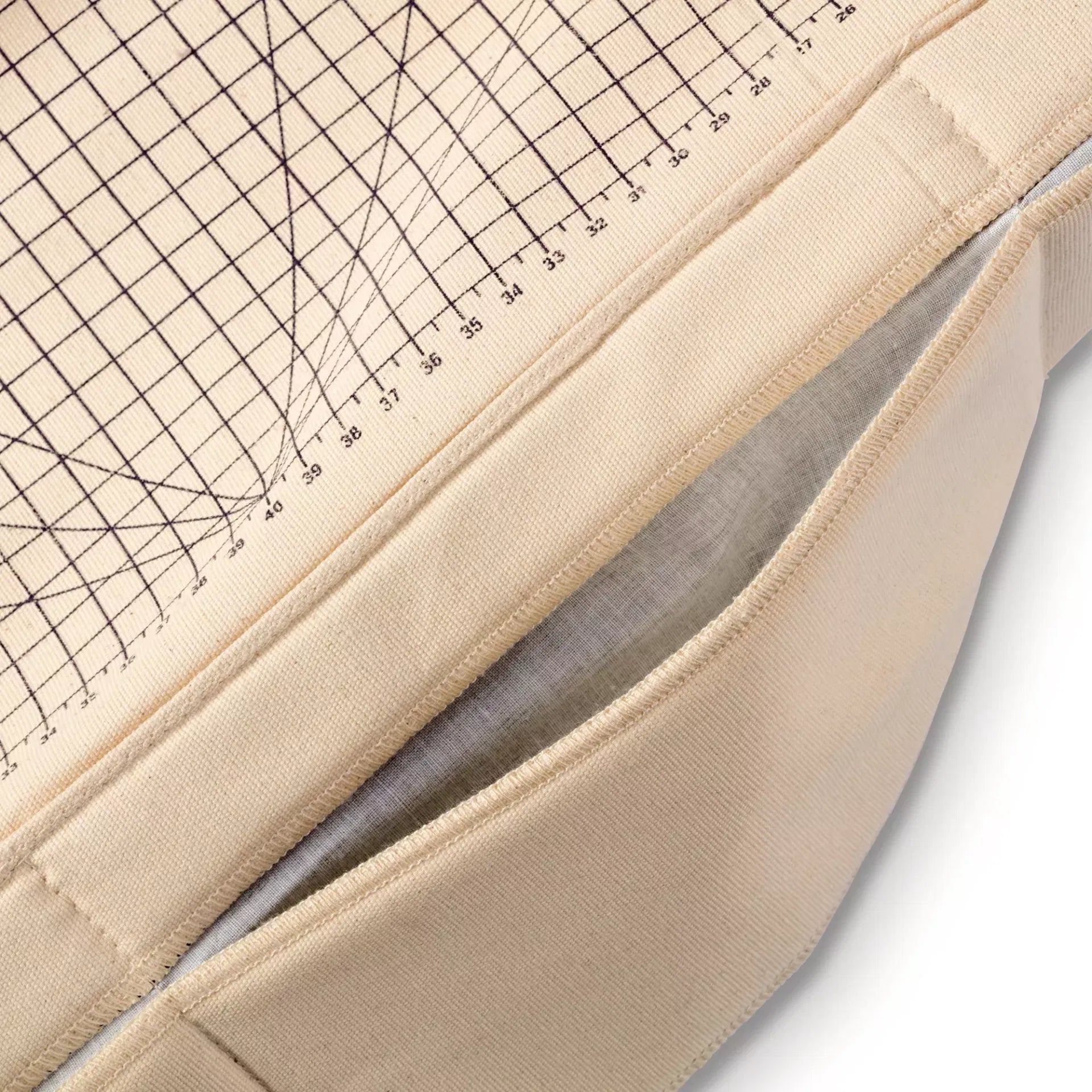It features a printed metric grid with clear angle markings for precise measuring, plus built-in pockets, a pincushion, a scissor loop and a small fabric scrap bag to keep your essentials tidy. The sturdy 100% cotton surface handles steam and dry ironing with ease, helping you press seams and blocks cleanly while working on garments, quilting, or patchwork.