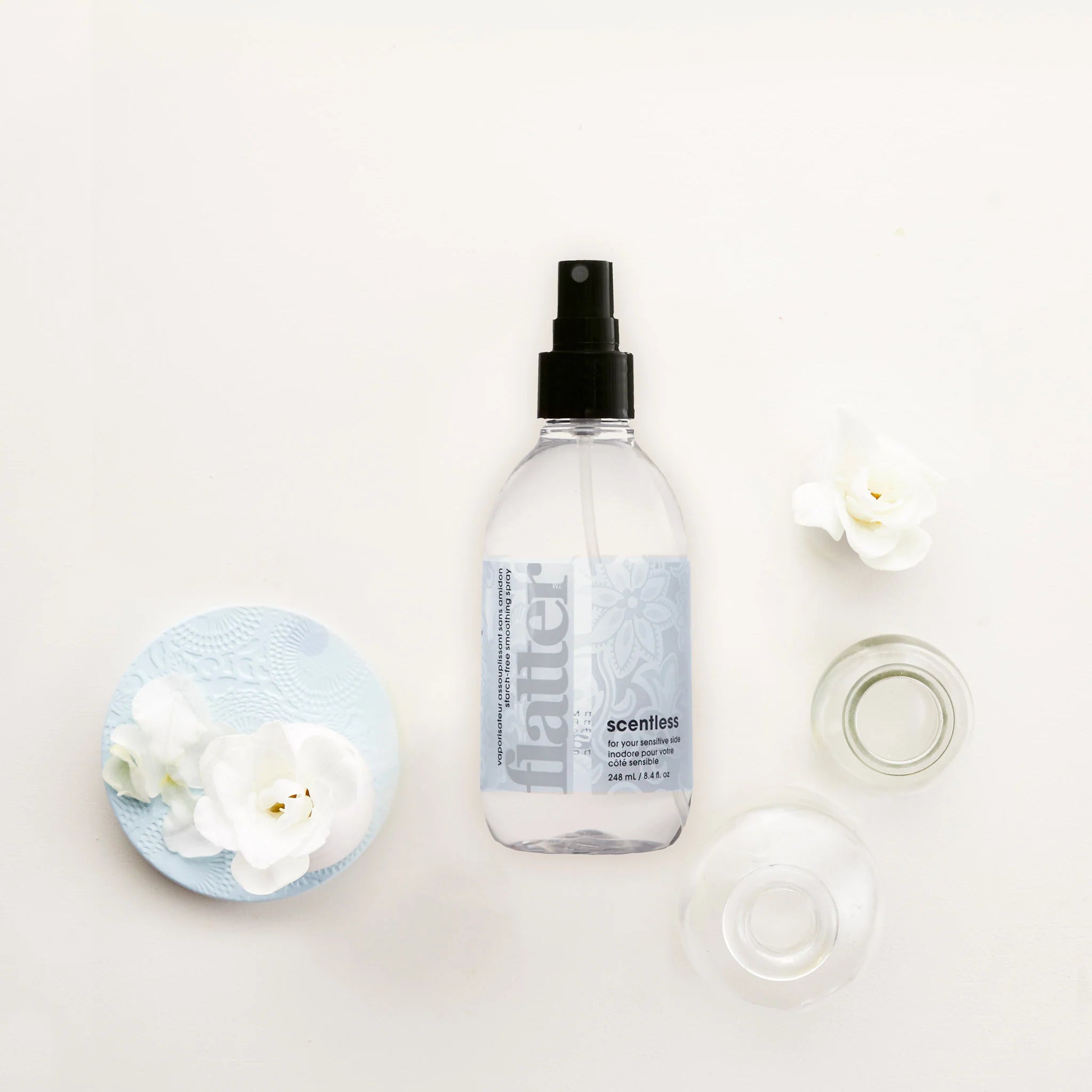 Relax wrinkles and banish creases with Flatter. This starch-free ironing & smoothing spray freshens fabrics, leaving them sleek, soft, and static-free.